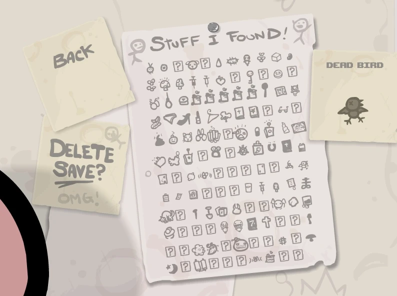 Incluyendo en la tabla están «Pills Here!» y «Tarot Cards», que no representaban objetos coleccionables ordinarios pero en vez clases de objetos totalmentes diferentes, píldoras y cartas respectivamente. Pero debido a algún error, en realidad era imposible «revelar» sus correspondientes espacios dejándolo en una tabla imposible de completar.