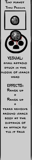 Tiny Planet jest przedmiotem dodanym w The Binding of Isaac: Rebirth. Znacznie zwiększa zasięg łez oraz powoduje, że krążą one wokół postaci niczym Blue Fly.