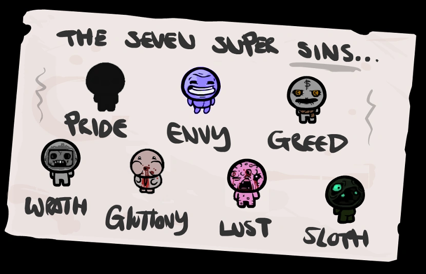 На каждом уровне есть шанс встретить Особую комнату, где игрок может сразиться с мини-боссом. Мини-боссы — это или персонифицированные версии семи смертных грехов или более легкие версии обычных боссов. После победы над всеми смертными грехами откроется Книга Греха и достижение в Steam (необязательно делать это за одно прохождение). Учтите, что эти враги могут появляться в обычных комнатах Утробе и Преисподней.