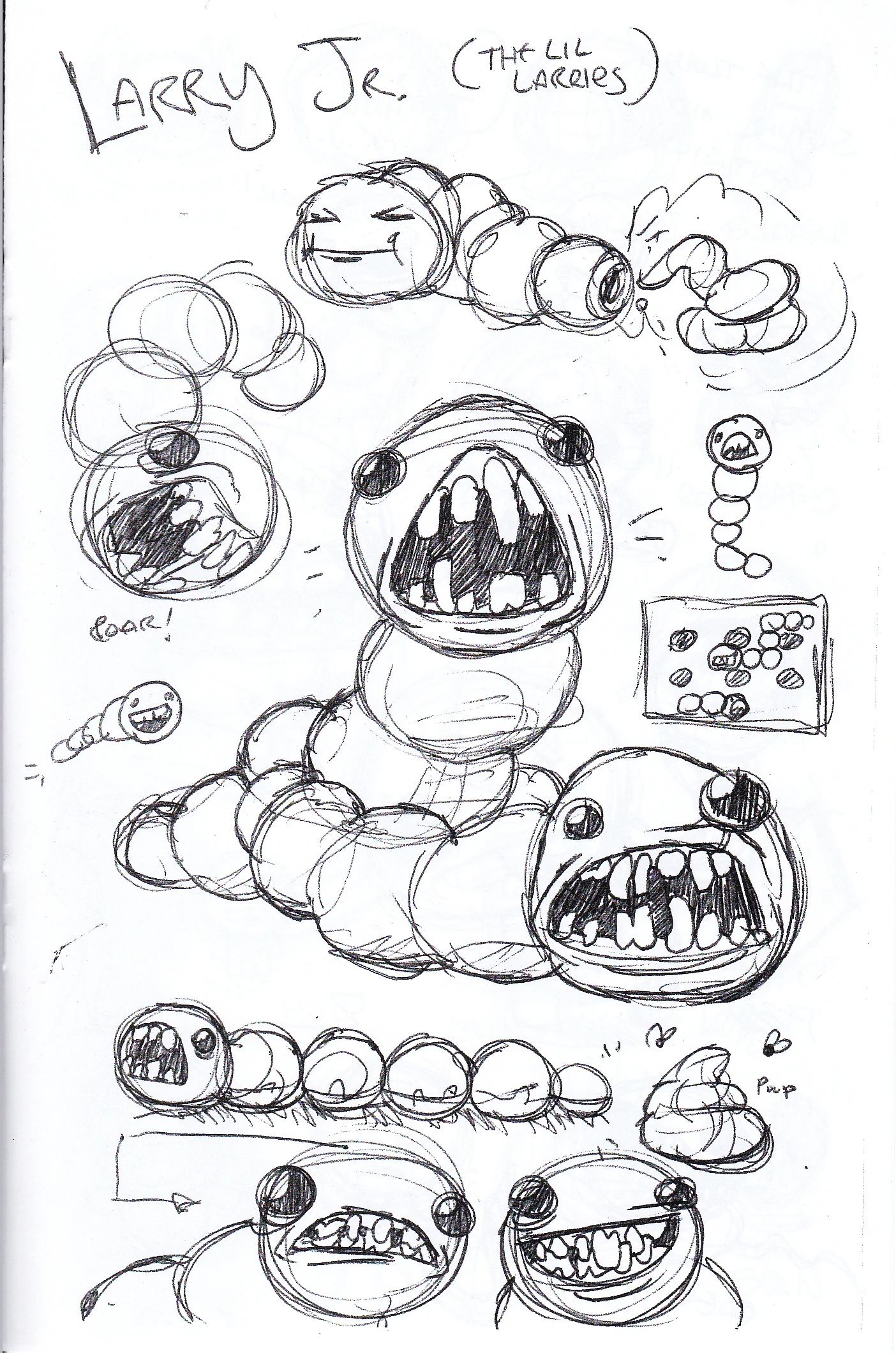 Larry Jr.'s name is a reference to Larries' Lament, which is the collective name for the three bosses of the fifth world of Super Meat Boy, a game made by Team Meat, which Edmund McMillen is also a member of.