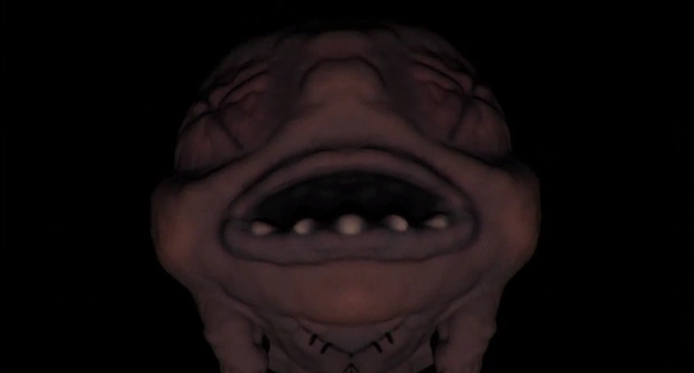 He is a large, circular humanoid with "punch-holes" for eyes, light-brown skin covered with multiple warts, and stubby limbs. He sports with a autopsy stitch from his chest. His mouth with crooked teeth-filled jaw is larger enough to be filled with swarm of flies.