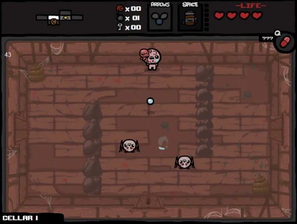Demonstrating the meshing of the old game with new features, this picture shows the Caves with the well-known enemies within. More interesting are the various items, such as a pink crown, yellowish glow, a tear effect turning Isaac's tears into teeth that appear to increase in size during their flight and a feather as a spacebar item. Also note the trinket in the upper left corner. Isaac's eyes also seem to be bleeding.