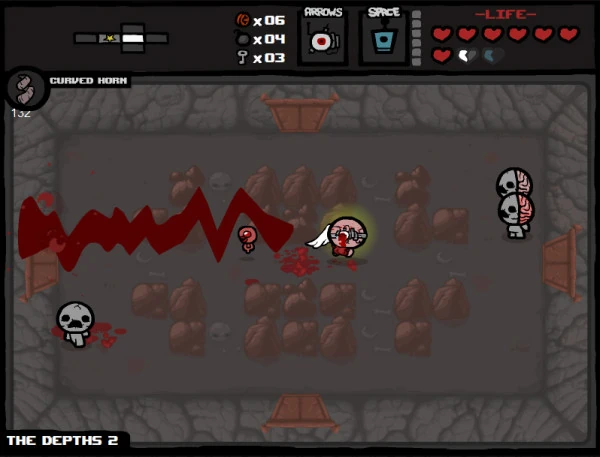 Among the displayed features are a few new monsters, such as the six-legged, spider-like enemies (including ones clinging to the ceiling) and floating children as well as a few from the main game, like flies and Mr. Maws. Also, a shop is shortly shown with new items like a Polaroid photograph, a small pile of bones, a reddish mass (perhaps entrails), a number of hearts and a strange rippled and curved object, which bears strong resemblance to the trinket called Curved Horn already seen in previous screenshots.